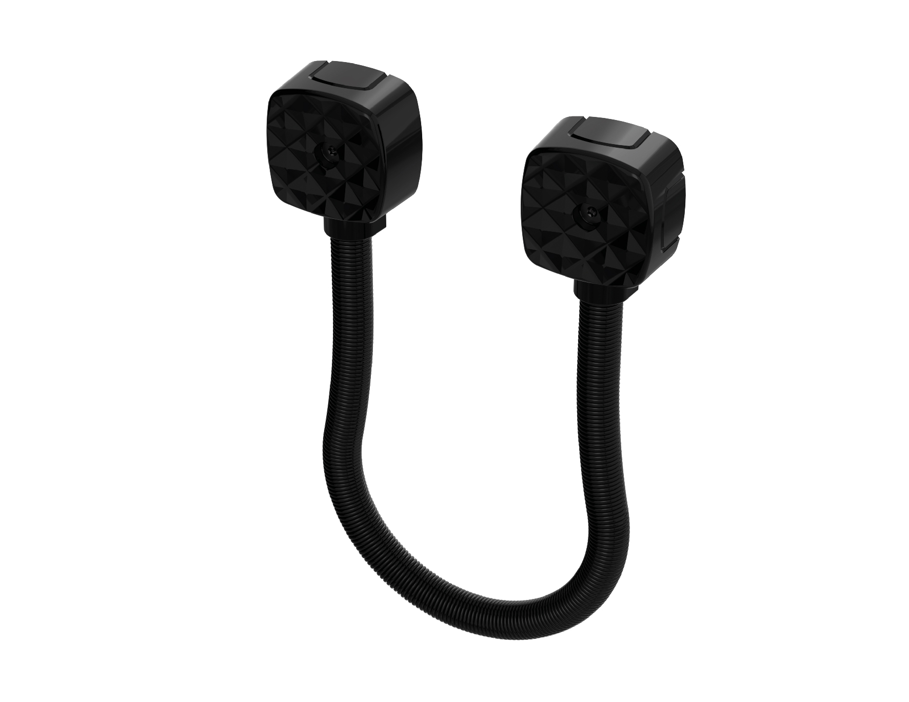 FLX1-N utenpåliggende kabeloverføring med fjær i rustfritt stål, innvendig Ø 13 mm, i farge sort. Endestykkene i metall har svekking i side og topp for montering av kabelkanal FLX-G i 1 m aluminium. Skrueføring i endestykkene styrer boring av hull ved montering. Skruene i stål har hode med sikkerhets-Torx for robust montering. FLX-G-N, kabelkanal i sort, bestilles separat.
