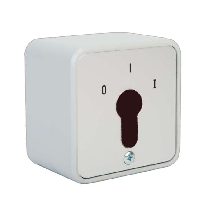 Utenpåliggende nøkkelbryter med mekanisk lås på boksen, leveres uten sylinder, lettmetallhus, beskyttelsesklasse IP 54. 1T — Returfjærende, 1 sidig, nøkkel uttrekkbar i AV-posisjon. Bryterinnsatsens funksjon kan omprogrammeres.